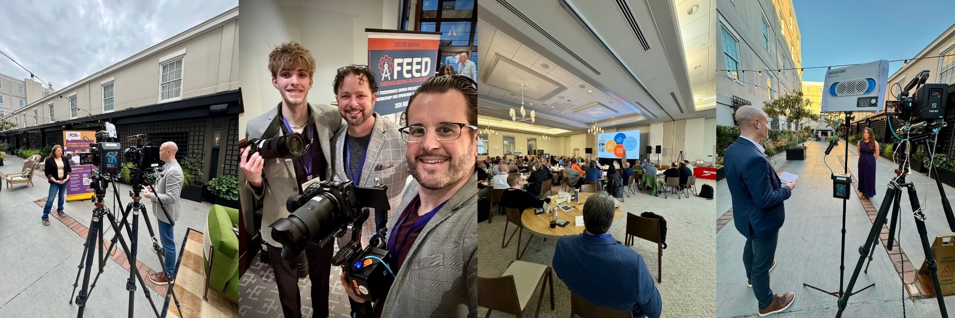 FEED Workshop conference production in Charleston, SC, featuring outdoor interview setups at the Emeline Hotel courtyard, the production crew with cameras in front of the FEED banner, the main session room during a presentation, and a two-camera interview vignette setup with professional lighting.
