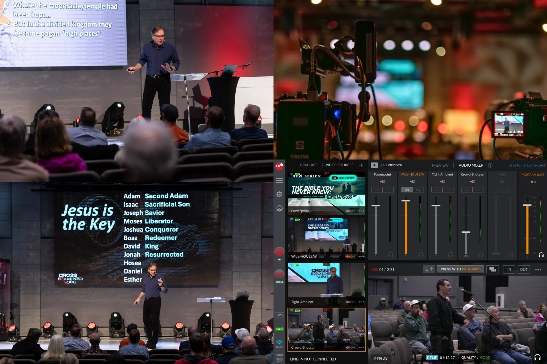 Multi-camera live stream production for Dr. Frank Turek's The Bible You Never Knew series, featuring stage coverage, audience perspective, and the live switching interface.