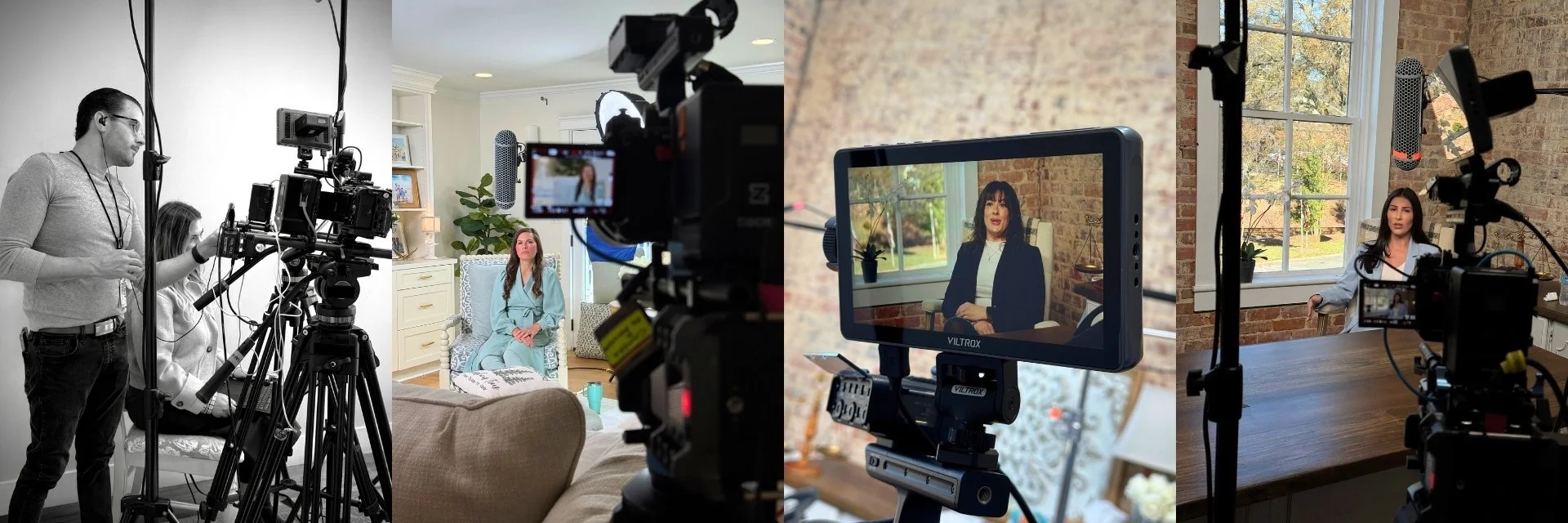 Two-day video production for Blood Law in Waxhaw, NC, featuring a multi-camera interview setup with cinematic lighting in a home setting, behind-the-camera framing of a lifestyle interview, and a monitor showing a sit-down attorney interview at the firm's office with professional lighting and audio.